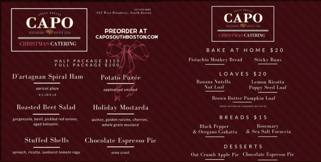 Capo is offering a tradition Christmas ham with all the fixings plus plenty of baked good and holiday cocktails!