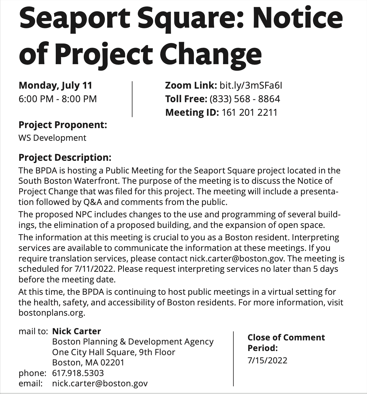 The Boston Planning and Development Agency will host a meeting on Monday, July 11 from 6:00pm – 8:00pm to discuss a notice of project change for Seaport Square. Zoom Link: bit.ly/3mSFa6I Toll Free: (833) 568 – 8864 Meeting ID: 161 201 2211